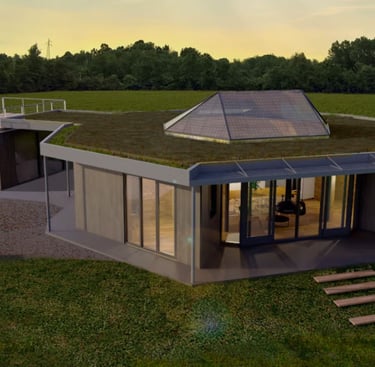 A solução arquitetônica organiza a casa a partir de um espaço central de estar e cozinha, concebido como um pátio habitável que se abre para o jardim. Em torno desse núcleo central, distribuem-se os demais ambientes e cômodos, criando uma sequência espacial contínua e intuitiva. Diferentemente de um pátio tradicional, este espaço é coberto por uma cúpula, que permite a entrada abundante de luz natural, ao mesmo tempo em que protege os usuários das intempéries.