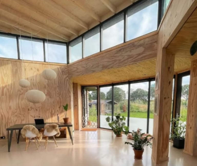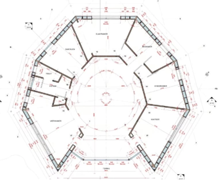 Localizada próxima à residência Land of Meaning, esta casa foi concebida para um casal jovem a partir de um processo profundamente participativo ativo. A Casa Octagram foi prefabricada em uma fábrica de madeira engenheirada em Goiás, transportada e montada na Holanda, combinando precisão industrial, eficiência construtiva e liberdade arquitetônica.